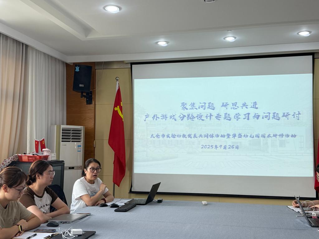2025年9月26日上午,太仓市实验幼教发展共同体的老师们在华盛幼儿园在三楼会议室开展了以“聚焦问题,研思共进——户外游戏分龄设计专题学习与问题研讨”为主题的园本教研活动。本次活动基于开学初的户外游戏教师问卷调研结果,旨在系统提升小果园区域活动的质量,构建“问题一策略”分层支持体系。