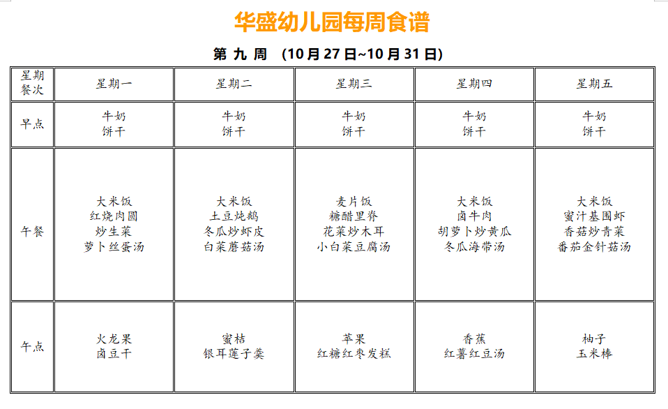 2025~2026(上)第九周华盛幼儿园幼儿营养食谱