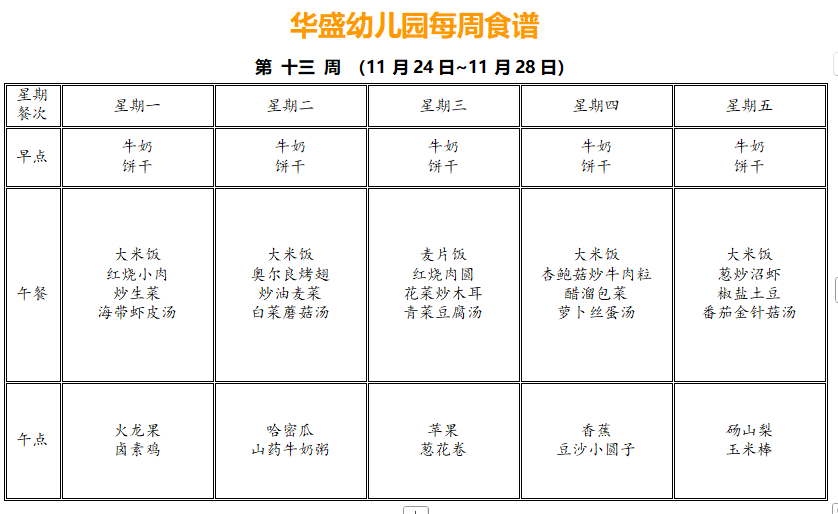 2025~2026(上)第十三周华盛幼儿园幼儿营养食谱